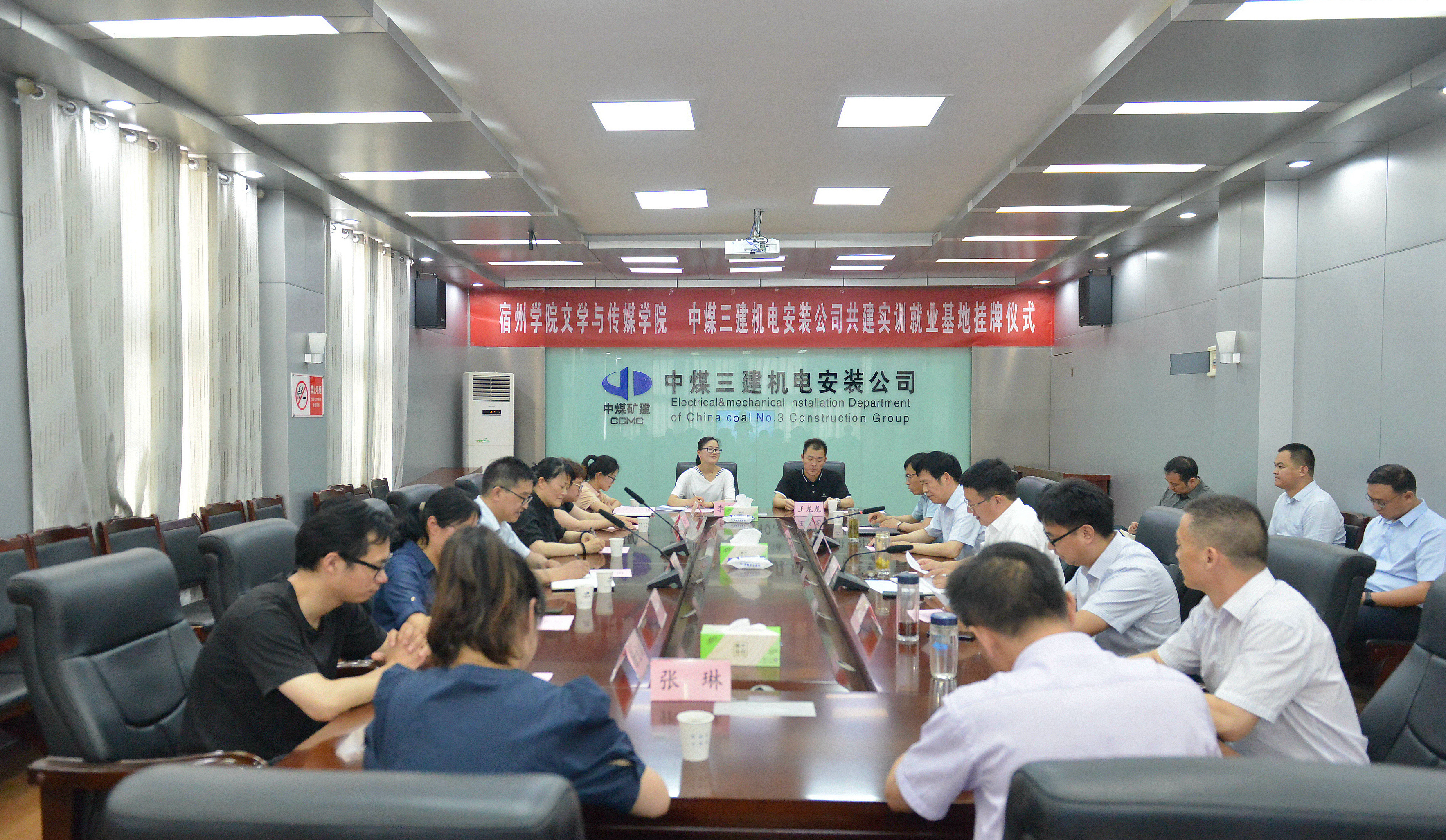 近日,机电安装公司与宿州学院文学与传媒学院共建实训就业基地挂牌仪式在机关四楼会议室举行。公司党委副书记、总经理张曙光,宿州学院文学与传媒学院党委书记杨文艺出席挂牌仪式。